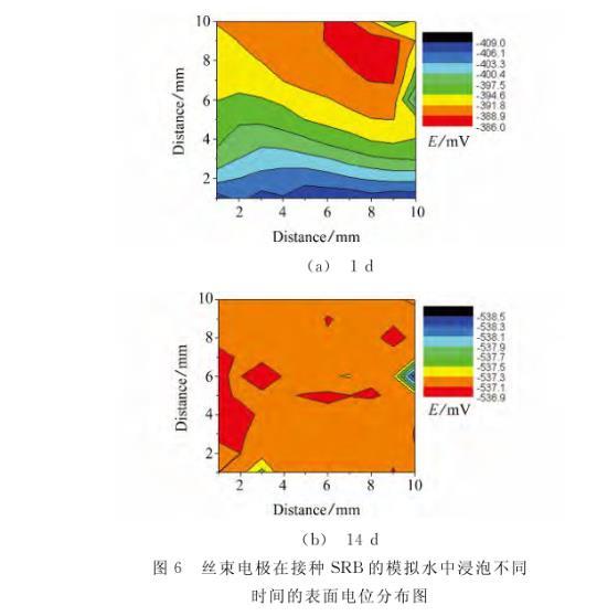 圖6絲束電極在接種SRB的模擬水中浸泡不同時間的表面電位分布圖