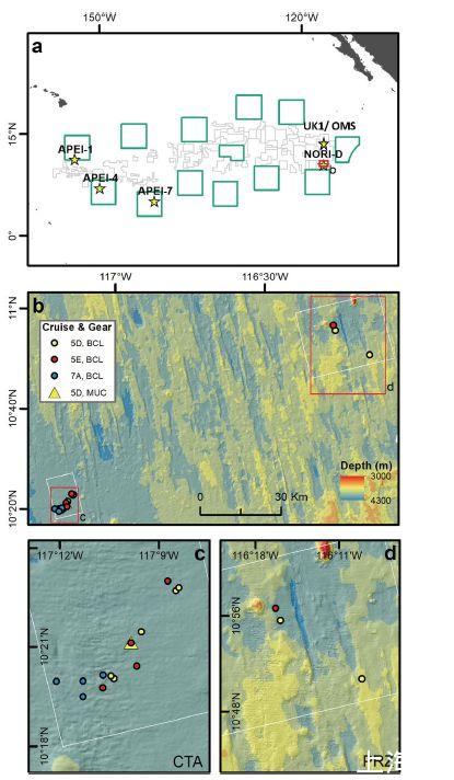 圖2、克拉里昂-克利珀頓區(CCZ)內的底棲室著陸器和多管取樣器部署位置底棲室著陸器(BCL)在APEIs 1、4和7(西CCZ)、UK1和OMS以及NORI-D(星號)的部署位置(a),以及NORI-D的兩個區域(Collector Test Area或CTA和Preservation Reference Zone或PRZ)(b-d)的中央深淵太平洋。圖c中還顯示了多管取樣器(MUC)的部署位置,該取樣器在5D航次期間采集了用于5D航次期間進行的原位實驗的沉積物樣本。
