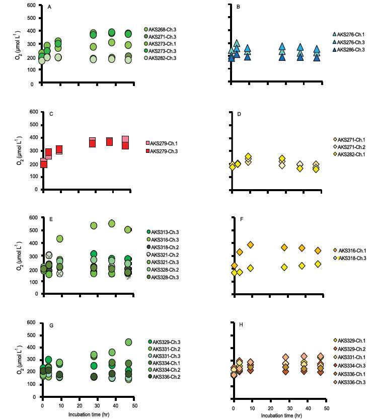 圖3、在NORI-D底棲室著陸器實驗期間通過Winkler滴定法測量的水樣中的氧氣濃度在不同處理下,定期從室內收集的水樣中通過微Winkler分析測量的平均氧氣濃度(μmol L?1)。處理包括5D(A)、5E(E)和7A(G)航次期間的死亡藻類生物質,5D航次期間的DIC+NH4+(B),5D航次期間的0.45-μm過濾海水(C),以及5D(D)、5E(F)和7A(H)航次期間的對照(無注射)。