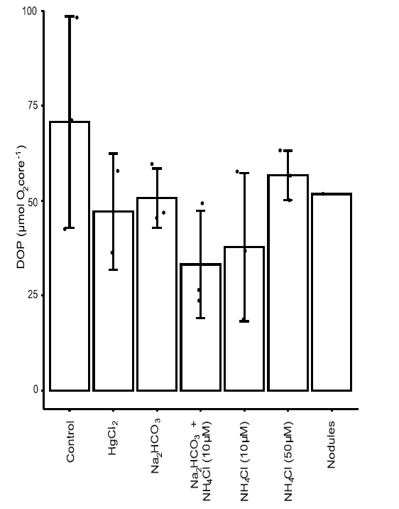 圖5、條形圖顯示了在原位外沉積物芯中的總凈O2產生。在5D航次期間進行的48小時原位外孵化中,沉積物芯(n=1-3)暴露于各種處理下的總凈O2產生(μmol O2 core?1)。O2產生是通過計算t=0小時和48小時之間覆蓋沉積物的水相中O2濃度的差異來確定的,同時考慮了芯體積。圖中也顯示了作為條形圖上方數據點的個別通量。