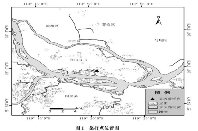 研究區(qū)位于閩江河口區(qū)福州平原的南分支——烏龍江的北岸,屬亞熱帶季風(fēng)氣候,年均氣溫為19.6℃,年均降水量為1 392.5 mm,蒸發(fā)量為1 413.7 mm,相對濕度為77.6%,地貌主要為沖海積平原,地表平坦,海拔3~5 m,零星分布剝蝕丘陵地貌。實(shí)驗(yàn)區(qū)(見圖1)位于福建省農(nóng)科院水稻所吳鳳綜合實(shí)驗(yàn)基地(26.1°N,119.3°E)內(nèi),該實(shí)驗(yàn)基地共有稻田7 hm2。土壤耕作層有機(jī)碳含量為18.11 g/kg,全氮1.28 g/kg,全磷1.07 g/kg。實(shí)驗(yàn)區(qū)內(nèi)主要實(shí)行早稻—晚稻—蔬菜的輪作制度,本實(shí)驗(yàn)點(diǎn)的前茬作物為花菜。水稻栽培品種為江西省農(nóng)科院研發(fā)的和盛10號,實(shí)驗(yàn)始于2011年8月初,至同年11月初收獲結(jié)束,實(shí)驗(yàn)前對翻耕后的田地進(jìn)行人工整平,以保持土壤的均一性,在同一塊大田內(nèi)共設(shè)置4個(gè)面積大小相等(長寬為4m×2m)的樣地,樣地之間分別用田埂互相隔開,以避免相鄰樣地間的干擾。在布置好的樣地進(jìn)行秧苗移栽:栽培方式選擇拋秧(PY)、手插(SC)、直播(ZB)、機(jī)插(JC)4種方式。施用底肥為復(fù)合肥和尿素,水稻生長期基本處于淹水狀態(tài),水深約5~7 cm,水稻成熟時(shí)曬田。