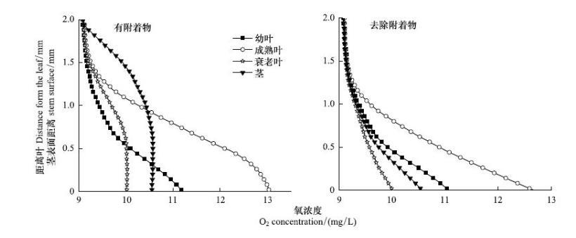 不同部位微界面O2的分布顯著不同(圖5)。幼葉由于光合活性較弱和附著物較少,O2隨距葉面距離的減小而增加,但增加幅度相對較小,葉面O2濃度為(11.21±0.22)mg/L。而成熟葉微界面中,O2濃度梯度增加幅度最大,進入附著層后O2增加幅度顯著降低,但由于成熟葉較強的光合活性和附著層的屏障作用,O2在附著層內繼續增大,在葉表面O2濃度達到最大值(13.05±0.61)mg/L。衰老葉和莖微界面中,離附著物越近O2濃度越高,在附著物表面達到最大值,分別為(10.02±0.10)mg/L,(10.55±0.30)mg/L,進入附著層后,O2濃度略呈下降趨勢。去除附著物后莖葉微界面O2分布發生了明顯變化。莖葉表面O2濃度明顯降低,幼葉和成熟葉表面O2濃度分別降至11.07和12.67mg/L(圖5)。衰老葉和莖由于去除了較厚的附著物呈逐漸增加的趨勢。