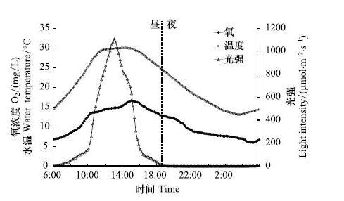 菹草葉表面O2存在明顯的晝夜變化,呈晝高夜低的單峰變化趨勢(圖4)。受光照和溫度的影響,白天,日出后O2濃度隨光照的增強持續升高,至15:00達到全天高峰16.68mg/L,此后O2濃度隨光照減弱持續下降,日落后,O2濃度繼續下降,至日出前5:10降至全天最低6.01mg/L。日出后,O2濃度又持續回升。