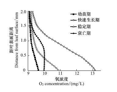 在菹草生命周期內,不同階段菹草葉微界面O2濃度梯度具明顯的變化(圖3)。幼苗期,菹草葉微界面O2濃度隨距葉面距離的減小而顯著增加,但增加幅度較小(葉表面O2濃度為(9.65±0.04)mg/L);進入快速生長期,葉微界面O2濃度梯度顯著增大(葉表面O2濃度為(10.90±0.21)mg/L);穩定期,葉微界面O2濃度梯度隨距離減小而增加幅度最大,葉表面O2濃度達到生命周內最大((13.16±0.40)mg/L)。衰亡期,葉微界面O2濃度增加幅度較小,但由于附著層較厚,影響了O2分布的趨勢,進入附著層后O2增加幅度顯著降低甚至出現了O2降低的現象。