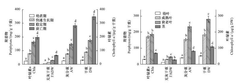 在菹草生命周期內,自幼苗期,隨著菹草的生長,附著在其葉表面的附著物持續增加(圖2),到衰亡期附著量達到最大。附著物葉綠素a含量、干重、灰分重和無灰分干重在菹草幼苗期、快速生長期、穩定期和衰亡期均存在顯著差異(圖2)。處于穩定期的成熟菹草,幼葉、成熟葉、衰老葉附著物量依次增加,而莖附著物量介于幼葉和成熟葉的之間。除附著物葉綠素a含量外,幼葉、成熟葉、衰老葉和莖附著物的干重、灰分重和無灰干重均存在顯著差異(圖2)。