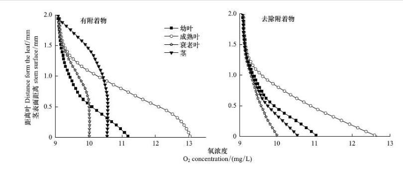 一般來說,隨著植物的生長發育,附著物的密度和生物多樣性逐漸增加。在衰亡期,病原體和細菌可通過受傷的部位侵入葉表皮細胞并迅速擴展,主動地降解周圍的細胞壁。侵入的病原體分泌有機酸,破壞了葉片細胞壁的微纖維結構,被侵入細胞和相鄰細胞壁聚合物的晶格結構脆弱松散。在菹草衰老葉片中,可能是附著物尤其是細菌在侵入前分泌的有機酸逐步進入葉肉和表皮,使細胞發生膨脹和解體。本研究中,去除附著物這一屏障后,微界面O2分布產生了明顯變化,莖葉表面O2濃度明顯降低,可能是O2擴散阻力和距離減小的緣故。因此,附著物大量而持續的附著可能加速了沉水植物衰亡和衰退。而富營養化水體中營養鹽含量和懸浮顆粒過高可顯著增加附著物。因此,菹草莖葉微界面O2濃度的分布可為研究水生植物生理生態和富營養化水體中養分的遷移轉化提供了重要信息。