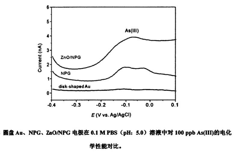 本論文主要以氧化鋅納米顆粒以及納米多孔金作為分析檢測(cè)三價(jià)砷的敏感材料。氧化鋅納米顆粒具有高比表面積、高孔隙率以及良好的穩(wěn)定性,為三價(jià)砷的檢測(cè)提供了大量的吸附位點(diǎn),提高了電極的吸附性能;納米多孔金增加了電極的活性面積且具有較高的催化活性促使電極表面的反應(yīng)能夠快速發(fā)生,提高金微電極檢測(cè)三價(jià)砷的效率。結(jié)果表明,兩種納米材料修飾的金微電極在近中性條件下檢測(cè)三價(jià)砷取得了良好的效果,為今后進(jìn)一步研究納米材料功能化微電極奠定了基礎(chǔ)。本論文具體研究工作如下:一、原位合成氧化鋅納米顆粒修飾納米多孔金微電極(ZnO/NPG-μE)用于近中性條件下三價(jià)砷的檢測(cè):以電化學(xué)合金/去合金方法構(gòu)建多孔金微電極的過程中伴隨著鋅的電化學(xué)沉積并在電極表面形成金鋅合金,通過控制循環(huán)過程中的終止電位來調(diào)節(jié)電極表面鋅的含量,進(jìn)一步熱處理可以實(shí)現(xiàn)金鋅合金在納米多孔金表面原位形成ZnO納米顆粒。