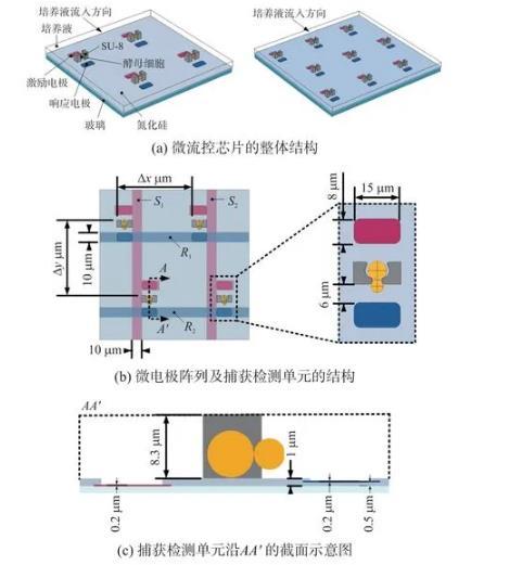 如圖1(a)所示,微流控芯片由玻璃襯底、鉻-金微電極陣列、氮化硅絕緣層、SU-8光刻膠捕獲-剪切結(jié)構(gòu)等組成。微電極陣列是酵母細(xì)胞EIS檢測的核心結(jié)構(gòu)。如圖1(b)、圖1(b)所示,微電極陣列由列電極(紅色部分)和行電極(藍(lán)色部分)交叉排列而成,SU-8捕獲-剪切結(jié)構(gòu)則分布于每個行列電極交叉處。所有行列電極寬度均為10μm。列電極與行電極表面有一層氮化硅絕緣層,在捕獲-剪切結(jié)構(gòu)上下游分別形成長為15μm,寬為8μm的圓角矩形開孔,用于對出芽酵母的電阻抗檢測。氮化硅絕緣層能夠有效避免微電極陣列間的電流串?dāng)_,提高電阻抗檢測的靈敏度。每個捕獲-剪切結(jié)構(gòu)以及與之對應(yīng)的絕緣層開孔處的微電極對即為一個酵母細(xì)胞的捕獲檢測單元。相鄰捕獲檢測單元的列間距設(shè)為Δx、行間距設(shè)為Δy。如圖1(b)、圖1(c)所示,捕獲-剪切結(jié)構(gòu)由2根對稱的SU-8微柱組成,微柱高為8.3μm,2根微柱的下游開孔寬度為3μm,與上下游氮化硅開孔距離均為6μm。圖1(c)為捕獲檢測單元沿AA′的截面示意圖,行列電極的厚度均為0.2μm,氮化硅層的總厚度為1μm。具體地,列電極位于玻璃襯底表面,行電極位于厚度為0.5μm的第一層氮化硅上表面。