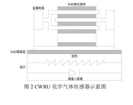 經查閱有關文獻發現,美國凱斯西儲大學曾提出過氧化錫氣體的傳感器,該傳感器為微機械開關化學傳感器,其模型包含一個基于N型硅片和P型擴散電阻為加熱元件,該模型的單片3mm×4mm的測溫二極管結構由PN結結構組成。該研究可將250 um厚度的硅基板腐蝕至6 um。在工作過程中通過控制算法對溫度進行控制,可檢測多種氣體類化學信號。對該傳感器相比同類傳感器穩定性和可靠性更高,主要原因在于半導體硅較低的能耗和較好的氣敏性能。該傳感器的示意圖如圖2所示: