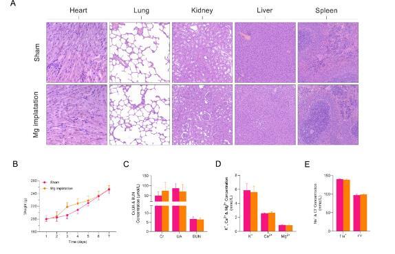 圖3、鎂片植入后的組織學發(fā)現(xiàn)和電解質(zhì)維持。MI后7天從假手術組和鎂植入組大鼠采集的心臟、肺、腎臟、肝臟和脾臟的H&E染色(A)。鎂片植入后7天內(nèi)大鼠體重變化(B)。血清Cr、BUN、UA、K+、Ca 2+、Mg 2+、Na+和Cl?鎂片植入后7天(C-E)。