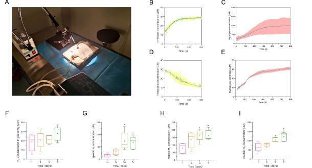 圖2、老鼠腔內(nèi)的氫氣擴散到大鼠的器官中。(A)拍攝高分辨率照片記錄了在通氣支持下接受手術的麻醉大鼠器官中氫濃度的檢測過程。吸入4%氫氣(n=3)期間大鼠心臟中的氫氣濃度,特別是吸入氫氣開始時(B)和停止后(D)。鎂片植入后評估氣腔(C)和心臟(E)中的氫氣濃度(n=3)。鎂片植入后1、3、5和7天氣腔和肝、心、脾組織中的氫氣濃度(F-I)。