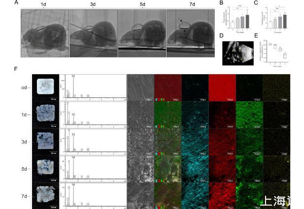 圖1、鎂片植入大鼠體內(nèi)后,鎂會降解并形成氣腔。(A)鎂片植入后,老鼠氣腔的X射線圖像隨時間變化。X射線中心線平行于鎂片的長軸投影。時間點為1、3、5和7天。(B,C)記錄同一時間點氣腔內(nèi)的張力變化,并測量氣腔的橫截面積(n=5)。(D)7天時對氣腔進行超聲檢查。(E)指向黑色區(qū)域的黃色箭頭代表皮下多室氣腔結構。(F)植入后鎂片質(zhì)量的變化。照片;掃描電鏡圖像;EDS光譜;利用氧、鎂、碳、氯和鈣的元素圖來研究植入前(0天)和植入后鎂片的腐蝕情況。在植入后的特定時間點(1、3、5和7天)系統(tǒng)地回收鎂片并徹底清潔。