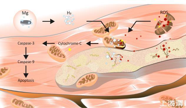 圖5、鎂片植入產(chǎn)生的氫氣及其對線粒體凋亡途徑的影響的示意圖。鎂片植入產(chǎn)生的氫氣可改善心肌梗死后大鼠的心臟氧化應激和細胞凋亡。