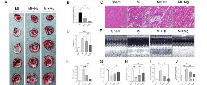 圖4、鎂片植入對大鼠心功能及心肌結構的影響。每組中具有代表性的TTC染色圖像和定量分析(A、B)。每組中具有代表性的H&E染色圖像。比例尺:50μm。箭頭表示炎癥細胞浸潤(C)。心臟損傷標記物cTnI的血清濃度(D)。從假手術、MI、MI+氫和MI+鎂組獲得的代表性M型超聲心動圖(E)。BNP濃度作為心力衰竭的血清生物標志物(F)。每組動物超聲心動圖測量的匯總數(shù)據(jù),包括EF(G)、LVID(H)、ESV(I)和FS(J)。
