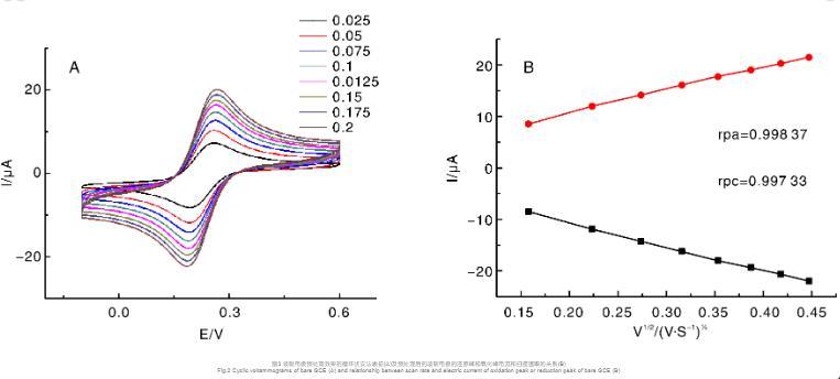 圖2玻碳電極預處理效果的循環伏安法表征(A)及預處理后的玻碳電極的還原峰和氧化峰電流和掃描速率的關系(B)
