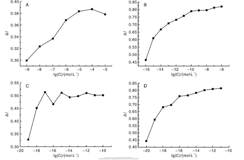 圖6玉米(A)在10-8~10-4 mol·L-1、辣椒(B)在10-16~10-14mol·L-1、花椰菜(C)在10-19~10-4 mol·L-1和黃瓜(D)在10-20~10-18mol·L-1濃度范圍內電流變化率及雙曲線擬合