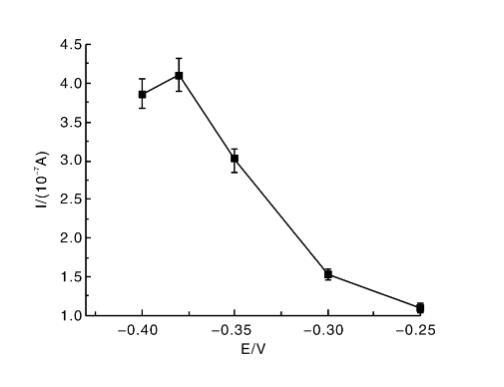 將構建好的植物根尖分生組織傳感器置于超純水中,采用電流—時間法,在不同電位下測試。以加入1×10-6mol·L-1的尿素前后穩態電流差去衡量不同電位對該傳感器電化學響應效果的影響。由圖4可知,該傳感器在-0.38 V時電流變化值最大,我們選擇-0.38 V為恒電位進行植物根尖分生組織傳感器對尿素傳感動力學特性的研究。