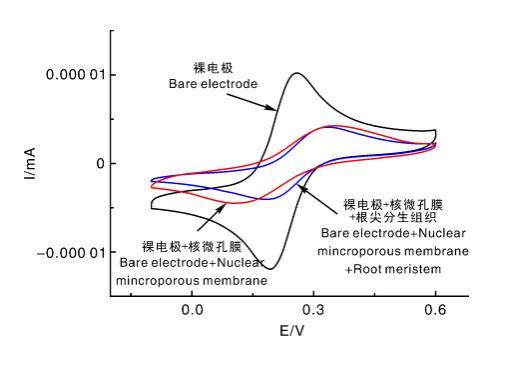 由圖3可以看出,在掃描速率為50 mV·s-1,掃描范圍為-0.1~0.6 V的條件下,玻碳電極使用雙核微孔膜組裝后,由于核微孔膜阻礙了電子向電極表面的傳遞,所以峰電流值低于裸電極峰電流值;在兩層膜中間組裝上植物根尖分生組織后峰電流值進一步減小,這是由于植物根尖分生組織進一步阻礙了電子的傳遞。由圖3峰電流的變化可以看出,該組織傳感器組裝成功。