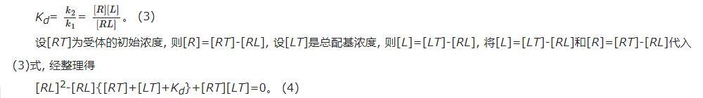 上式為以[RL]為變量的一個雙曲線一元二次方程。當[RT]、Kd為固定時,[RL]隨[LT]的變化而變化,開始上升地很快,以后逐漸趨向于水平,這就是受體—配體互作的飽和曲線。該式說明了受體與配體的結合具有配體飽和的效應,和米氏酶促反應動力學有相似的特征。于是我們可以獲得類似于Km值的重要動力學參數Ka(配體—受體互作所產生的聯動變構激活常數)。