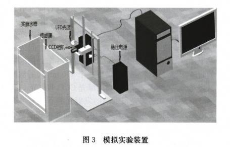 熒光圖像采用美國JAI AT-200GE面陣3CCD相機,該相機在R/G/B 3個波段各采用了1個1/1.8英寸CCD,每個CCD的像素分辨率為1 624×1 236。利用3CCD相機,其中2個光譜帶CCD可以分別記錄熒光指示劑的發射熒光和香豆素的參考光,同時在鏡頭前端安置一個長通濾波片(>470 nm),阻止背景光及激發反射光進入鏡頭。實驗觀測裝置如圖3所示,3CCD相機正對傳感膜,而光源與傳感膜觀測面呈30°角。