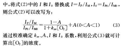 為克服熒光強度測量容易受外界環境的照射強度、光照不均勻及熒光指示劑分布不均勻等因素的影響而導致測量精度和穩定性下降的缺陷,采用比率測量法,即同時測量對溶解氧不敏感的熒光作為參考光,利用同步測量的指示劑熒光激發強度與參考光強的比值替代單一的發射熒光,這樣可以有效地改善發射熒光強度測量對環境因素敏感的問題。在比率法測量中,將式(2)中的I和I0替換成I=IP/IM,I0=IP0/IM0,則公式(2)可以改寫為: