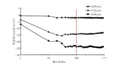 湍流紊動值計算采用滑動平均法,該方法中滑動平均窗口長度的選取對氧通量的計算結(jié)果影響很大,當(dāng)選取的窗口長度過小,會排除大尺度的紊動,造成通量低估;當(dāng)選取的窗口長度過大,會引入非穩(wěn)定成分,使得氧通量出現(xiàn)波動。為確定合適的窗口長度,將初始窗口長度設(shè)為1 s,計算該窗口長度下氧通量,之后逐漸增加窗口長度,重復(fù)進(jìn)行上述步驟,獲得不同窗口長度下的氧通量,當(dāng)通量達(dá)到穩(wěn)定時所對應(yīng)的窗口長度即為合適的窗口長度,計算過程如圖5所示??梢钥闯?,當(dāng)窗口長度為100 s時,不同水平流速下的氧通量均可保持穩(wěn)定,因此本次試驗(yàn)選取100 s作為最終窗口長度。