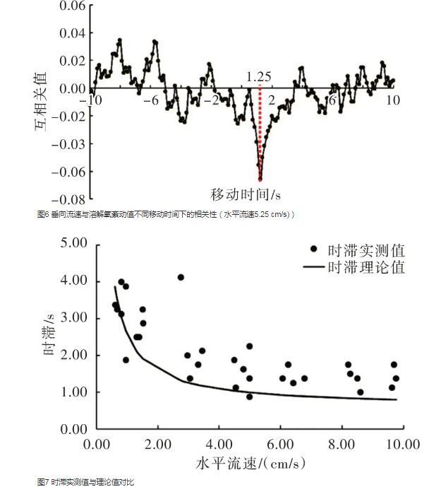 由于氧通量結(jié)果對時滯取值較為敏感,而理論時滯與實(shí)際情況存在一定偏差,因此實(shí)際應(yīng)用較少采用理論值。本文參照Lorrai等的方法確定實(shí)際時滯大小,首先參照相關(guān)研究中時滯大小,確定時滯的取值為10 s,接著將溶解氧紊動值相對于垂向流速紊動值的時間序列進(jìn)行移動,并計算兩者的相關(guān)性,時滯即為最大相關(guān)性所對應(yīng)的移動時間。利用Matlab軟件中的xcorr函數(shù)進(jìn)行時滯校正。圖6為水平流速5.25 cm/s下垂向流速與溶解氧紊動值相關(guān)性隨移動時間的變化情況,可以看出,當(dāng)移動時間為1.25 s時,溶解氧和垂向流速紊動值的相關(guān)性最大,因此該水平流速下的時滯為1.25 s。采用相同方法,將不同水平流速下時滯的實(shí)測值與理論值進(jìn)行分析(圖7),可以看出,時滯隨水平流速的增大而減小且與理論值擬合情況良好。說明理論時滯雖與實(shí)際情況存在一定偏差,但在實(shí)際應(yīng)用中可以根據(jù)流速條件得到理論時滯值后,為時滯取值范圍的確定提供參考。