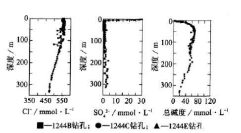 圖1 ODP204航次1244站位孔隙水中Cl–,SO42–和堿度含量變化