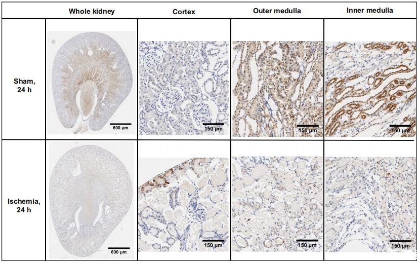 圖3、雙側腎缺血或假缺血恢復24小時后腎臟切片的咪唑加合物免疫組化。圖片為每組六個腎臟皮質、外髓質和內髓質區域的典型圖像。