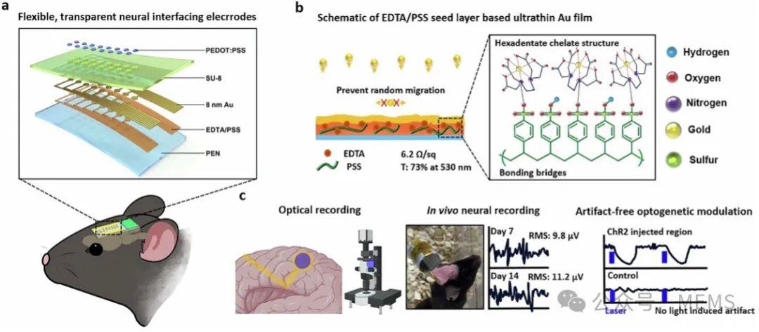 圖1應用于電-光神經接口的基于EDTA/PSS聚合物種子層的超薄金μECoG電極陣列示意圖