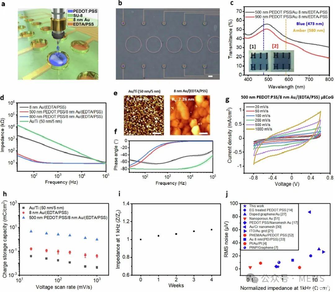 研究人員對上述兩種版本μECoG電極陣列的電化學特性進行了表征。結果表明,500 nm PEDOT:PSS/8 nm Au/(EDTA/PSS)μECoG在提供光學透明的同時仍然屬于性能最好的一組。