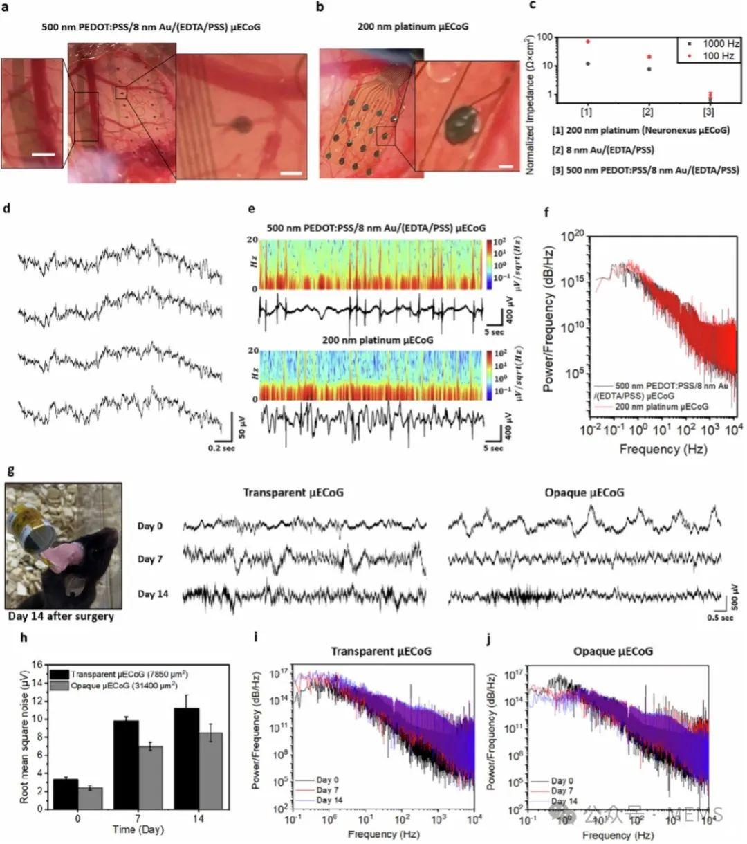 為了驗證透明μECoG電極陣列在體內的長期穩定性和記錄性能,研究人員使用透明和不透明的μECoG電極陣列進行了為期2周的記錄實驗(圖5g)。結果表明,兩種μECoG電極陣列都顯示出穩定的腦電波記錄性能,即使在2周后,均方根(RMS)噪聲水平的下降也非常小。