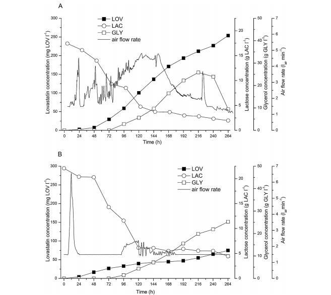 圖5、洛伐他汀、乳糖和甘油濃度以及連續(xù)分批補(bǔ)料工藝(A)在預(yù)培養(yǎng)過程中添加12克/升滑石粉微粒(運(yùn)行T21)和(B)不添加微粒(對(duì)照運(yùn)行T24)的空氣流速的時(shí)間變化。