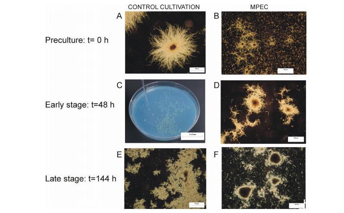 使用MPEC后,土霉菌生產(chǎn)洛伐他汀的所有這些積極變化都與顆粒結(jié)構(gòu)和大小的變化有關(guān)。圖7顯示了實(shí)驗(yàn)不同階段的顆粒。首先,滑石微粒的添加導(dǎo)致預(yù)培養(yǎng)的顆粒變小(比較圖7A和B)。在孢子數(shù)量相同的情況下,不添加微顆粒時(shí),預(yù)培養(yǎng)物中顆粒的平均直徑約為500-700米(圖7A)。經(jīng)形態(tài)改造的顆粒至少小三倍(圖7B)。因此,在MPEC培養(yǎng)過程中,生物反應(yīng)器中沒有出現(xiàn)大顆粒(即直徑約為1500-2500米的顆粒),但在對(duì)照實(shí)驗(yàn)的48小時(shí)內(nèi)可以看到它們(圖7C)。在不使用滑石粉的情況下,雖然形成了大顆粒,但在許多情況下,它們?cè)谶\(yùn)行后期由于剪切應(yīng)力而被破壞,形成分散的形態(tài)(圖7E)。雖然乍一看這種分散的形態(tài)似乎更有利于氧氣的傳輸,但它并不能保證良好的洛伐他汀滴度。經(jīng)過形態(tài)改造的小顆粒大部分未被破壞(觀察到的自由分散的菌絲較少),而且足夠小(約300-500μm),這才保證了氧氣能夠很好地進(jìn)入菌絲(圖7D和F)。因此,為了改善洛伐他汀的生物合成,需要"自然"形成小顆粒和分散的菌絲:這種形態(tài)不應(yīng)該是大顆粒被破壞的結(jié)果??傊?,微小顆粒因其穩(wěn)定的結(jié)構(gòu)和最小的氧傳遞阻力,是生產(chǎn)洛伐他汀的最佳選擇。