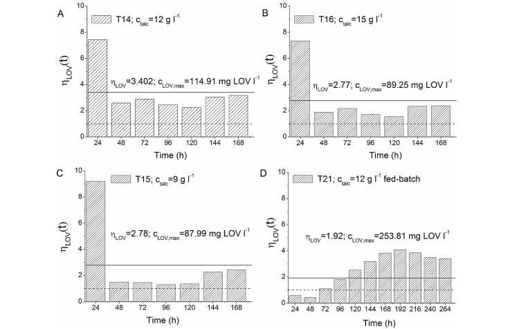 圖6、A.12g/l(B)15g/l(C)9g/l的批次培養(yǎng)和(D)12g/l的分批補(bǔ)料培養(yǎng)中,在土霉菌的預(yù)培養(yǎng)中添加滑石微粒對(duì)洛伐他汀滴度比和最大洛伐他汀滴度的影響;水平虛線表示LOV(t)值等于1(微粒無(wú)影響),水平實(shí)線表示平均LOV值。
