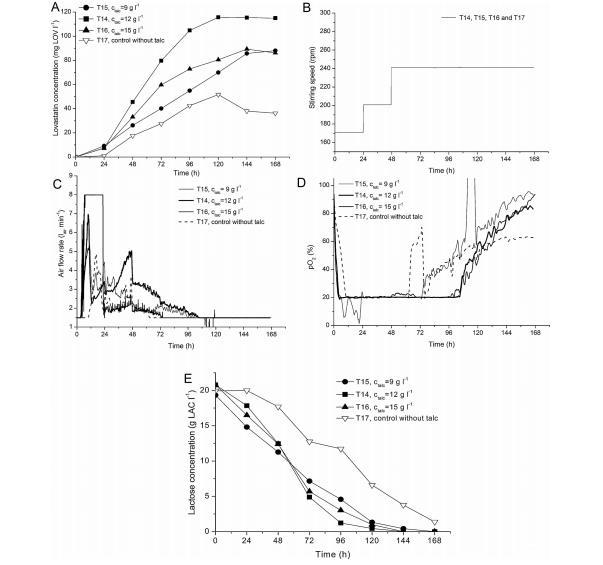 為了減小土霉菌顆粒的大小并改變其結(jié)構(gòu),在批處理模式下用于接種生物反應(yīng)器的預(yù)培養(yǎng)物中添加了不同量的滑石粉(9、12和15克/升)(分別為運(yùn)行T15、T14和T16)(圖4)。此外,還進(jìn)行了接種標(biāo)準(zhǔn)預(yù)培養(yǎng)物的對(duì)照運(yùn)行(運(yùn)行T17)。為了研究微顆粒對(duì)洛伐他汀生產(chǎn)的影響,并盡量減少影響真菌形態(tài)的其他因素,這四次運(yùn)行的攪拌速度具有相同的時(shí)間曲線,并手動(dòng)控制在圖4B所示的水平。這些水平是攪拌肉湯和延遲顆粒破壞(如果發(fā)生的話)的最佳水平。只改變了氣流速率(以保持20%的氧飽和度)。