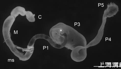 圖1:Nasutitermes corniger的腸道。腸道包括嗉囊(C)、中腸(M)、混合段(ms)和幾個(gè)后腸節(jié)段(P1至P5);星號(hào)(*)標(biāo)記P2(幽門瓣)的位置。