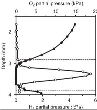 圖2:在瓊脂糖包埋的Nasutitermes corniger前部P3隔室中,相對(duì)于瓊脂糖表面的氧氣(O)和氫氣(O)分壓的徑向分布圖。虛線標(biāo)出了近端和遠(yuǎn)端腸壁的位置。這些曲線是從不同白蟻身上獲得的六組相似結(jié)果中選出的典型代表。
