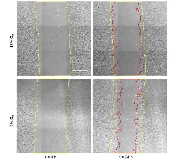 圖2內皮傷口愈合試驗。相位對比圖像示例,顯示實驗開始時(t=0小時)和細胞培養24小時后,在持續暴露于13%O2氧氣(上圖)和4%O2氧氣(下圖)條件下的細胞單層傷口。黃線和紅線分別表示初始和最終傷口邊界。在這個具有代表性的例子中,氧氣濃度為13%時,傷口閉合面積減少了20.5%,氧氣濃度為4%時,傷口閉合面積減少了44.7%。比例尺為500μm。