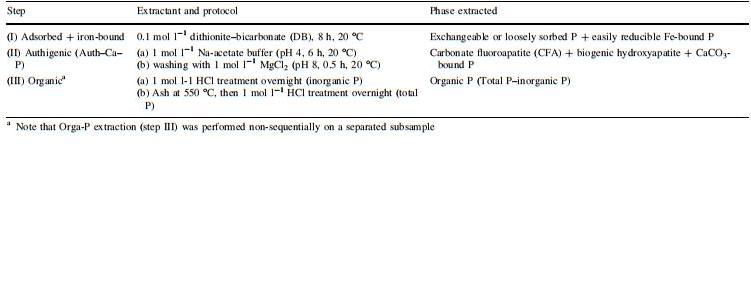 表2沉積物中磷形態的連續提取方法;吸附和鐵氧化物結合磷(Fe-P)、自生鈣結合磷(Auth-Ca-P);Fe-P和Auth-Ca-P依據Psenner et al.1988;Ruttenberg 1990;Slomp et al.1996);有機磷(Orga-P;Aspila et al.1976)
