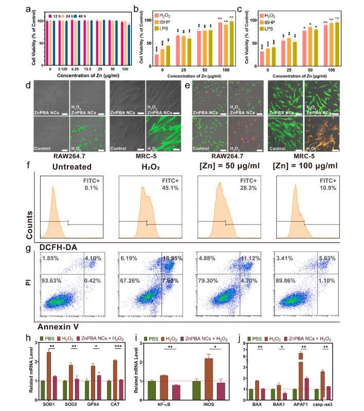 此外,我們使用AnnexinV-FITC/PI試劑盒評估了與H2O2和/或ZnPBA NCs共孵育后的RAW264.7和MRC-5細胞。與H2O2組明顯的細胞凋亡信號(紅色熒光)相比,ZnPBA NCs對氧化應激導致的細胞凋亡有很強的抑制作用,驗證了ZnPBA NCs能有效緩解ROS誘導的氧化應激,防止細胞凋亡(圖4e)。此外,還利用流式細胞儀對不同處理的DCFH-DA染色細胞進行了分析,以定量評估ZnPBA NCs消除氧化應激的性能。