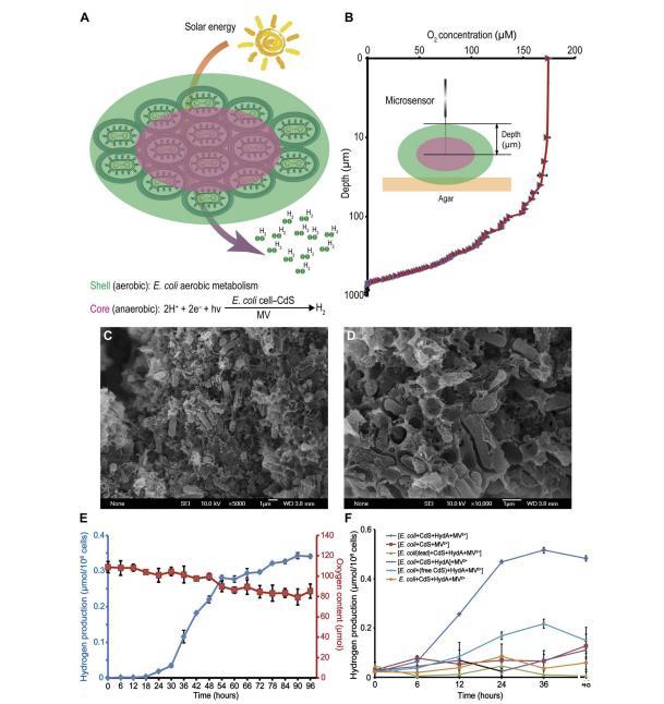圖3封裝混合系統(tǒng)在空氣中的光驅(qū)動制氫。(A)由仿生聚合物封裝的半導(dǎo)體工程大腸桿菌混合系統(tǒng)中的SFD。(B)基于氧微電極測量不同獨立封裝細(xì)胞聚集體中的氧氣濃度。(C和D)不同放大倍數(shù)下封裝細(xì)胞聚集體的掃描電鏡圖像。