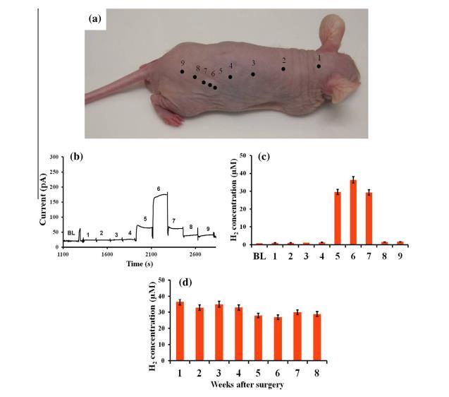 圖3、AZ31植入皮下1周后,對麻醉裸鼠進行H2測量。(a)標有測量點并編號的小鼠照片。(b)與(a)中編號點相對應的瞬間電流反應。(c)根據校準曲線測定的各點H2濃度。BL是在空氣中的測量值。(d)AZ31(N=3)在為期8周的研究期間每周監測的H2濃度。每只小鼠以植入物正上方為中心進行一次測量。