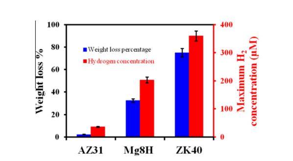 圖4、三種合金在植入2個月后重量減輕百分比與植入第一周后氫電極在體內測得的最大H2濃度的相關性。誤差為三只小鼠(N=3)測量值的標準偏差。