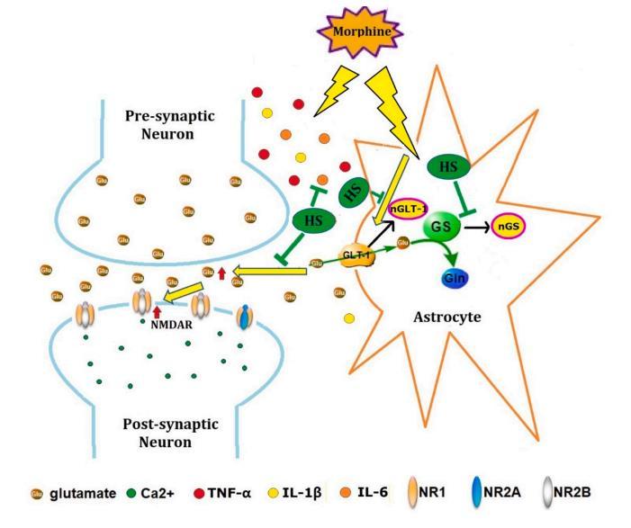 嗎啡的反復鞘內給藥一方面增加了TNF-α和IL-1β等炎癥因子的水平和IL-6的釋放,激活了脊髓背角的星形膠質細胞,另一方面導致了GLT-1和GS的硝酸化表達,增加了突觸間隙中谷氨酸的濃度,促進了含有NR2B亞基的NMDA受體的膜販運,導致了中樞敏化和嗎啡耐受。HS預處理可減少炎癥細胞因子的增加,抑制GLT-1和GS的硝化表達,減少NMDA受體的膜販運。因此,HS可能為預防嗎啡耐受提供了可能。