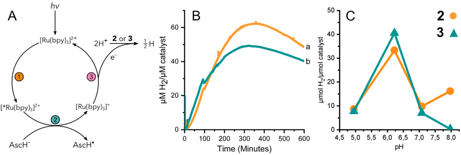 圖3(A)光激活HER的反應方案。(B)H2由2(a,橙色)和3(b,青綠色)在光催化條件下pH 6.2產生。通過H2感應電極檢測。(C)在反應完備時,在pH條件下的頭間檢測到H2。