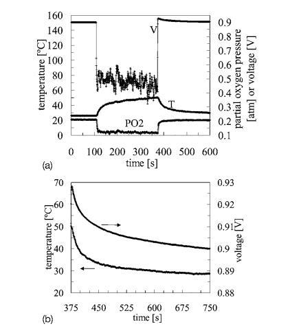 瞬態測量—圖11a顯示了在0和333~mA/cm^2之間的電流中斷脈沖循環期間記錄的電壓、溫度和PO2瞬態。在大約375~s時發生的電壓瞬變在圖11a的尺度上難以分辨,因此在圖11b中提供了放大版本。圖11b中的氧氣瞬變可以擬合到一個單指數模型,時間常數tauO2sim 6~s。這個短的、單一的時間常數可能與邊界層中的O2擴散有關。相比之下,溫度瞬變需要用指數項和線性項進行擬合。指數項(tauTsim 20~s)可能與燃料電池本體的熱質量以及熱邊界層的建立有關。線性項(sim 0.19^circC/min)是由陰極持續積水導致氣體擴散層傳質損失增加,進而引起電池自加熱增加引起的。如果液態水從陰極表面連續去除,則不存在該線性項。