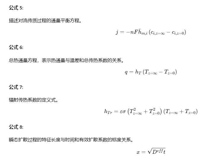 DO2^texteff和DH2O^texteff值與公布的氧氣在空氣中的自由擴散系數D02(對于298 K<T<330 K,為0.24-0.29 cm2/s)以及水蒸氣在空氣中的自由擴散系數DH2O(對于298 K<T<330 K,為0.26-0.30 cm2/s)處于同一數量級。測量的擴散系數與公布值之間的差異可能是由于自然對流的影響、陰極流道中的非平面擴散、以及由于濕度探針的有限體積、實際布拉格光柵溫度與熱電偶讀數之間的差異等引起的RH測量不確定度造成的。作為上述簡單擴散分析的替代方法,我們在此提供傳質系數的估計值。為此,我們使用以下通量平衡方程描述對流傳質: