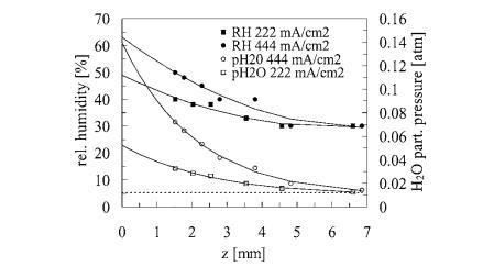 圖12顯示了在相同的電流負載循環條件(在0和333 mA/cm2之間)下測量的RH和PH2O瞬態。雖然RH信號顯示非常小的瞬態響應,但PH2O響應在恒定電流負載下顯示出較大的變化。PH2O瞬變的初始部分可以用指數函數近似,得出時間常數TH2O~14 s。這個時間常數基本上反映了濕度傳感器的上升時間,因此初始PH2O瞬變時間尺度的精確測量未能實現,但我們可以將其值限定在小于約14 s。隨后PH2O隨時間增加的速度要慢得多,并且是非指數性質的。這種響應表明陰極表面有液態水積聚,如先前所述。當電流在t~1500 s中斷時,PH2O迅速恢復到環境條件,同樣具有約14 s的弛豫時間。(然而這次請注意,PH2O信號沒有表現出次要的線性分量。)另一方面,RH響應顯示出有趣的超調行為。最可能的是,這種超調與濕度傳感器固有響應時間的限制有關(參見濕度傳感器校準部分)。為完整起見,我們注意到,這種超調也可能是由于水生產立即中斷與電池溫度緩慢下降之間的時間滯后造成的。由于這種滯后,陰極上方仍然溫暖的空氣將經歷RH的突然下降,隨著電池(和周圍空氣)冷卻下來,RH presumably會恢復。