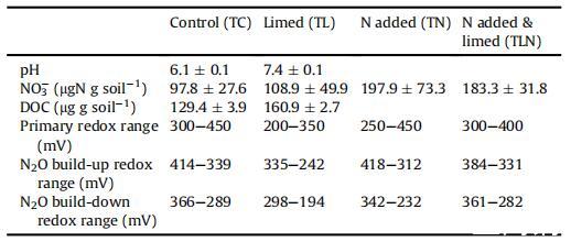 表格1 土壤 pH、NO3 和 DOC 濃度以及絕對值和絕對值的概述 主要氧化還原范圍和“積聚”和“積聚”階段的氧化還原范圍 所有四種處理的 N2O (n = 3)。